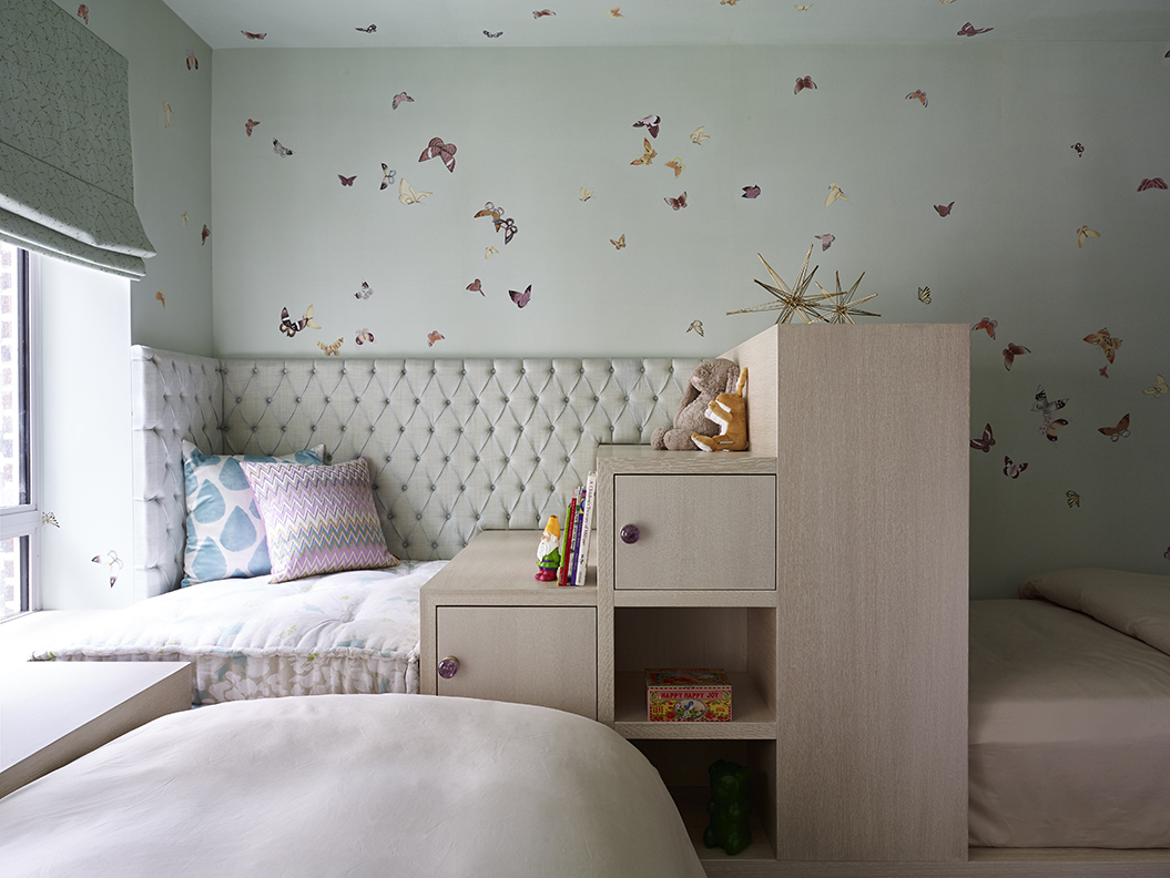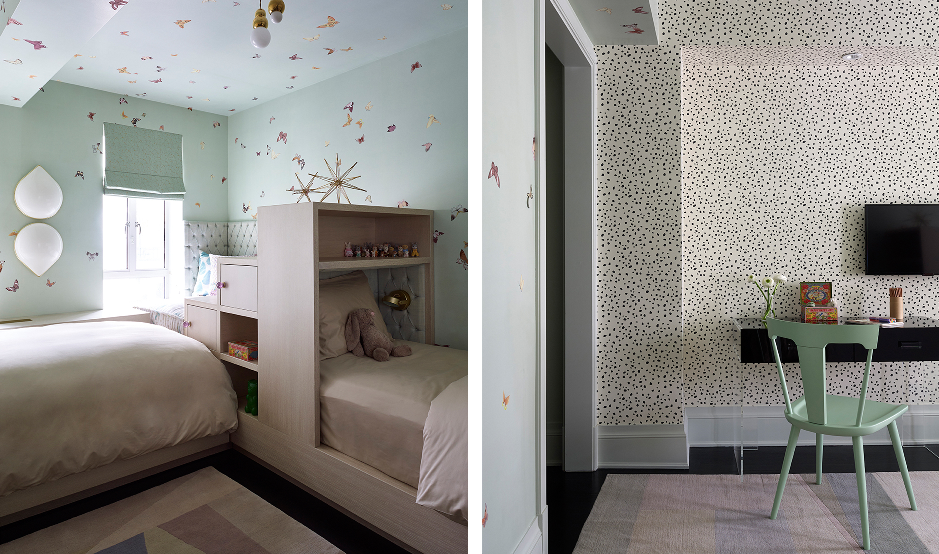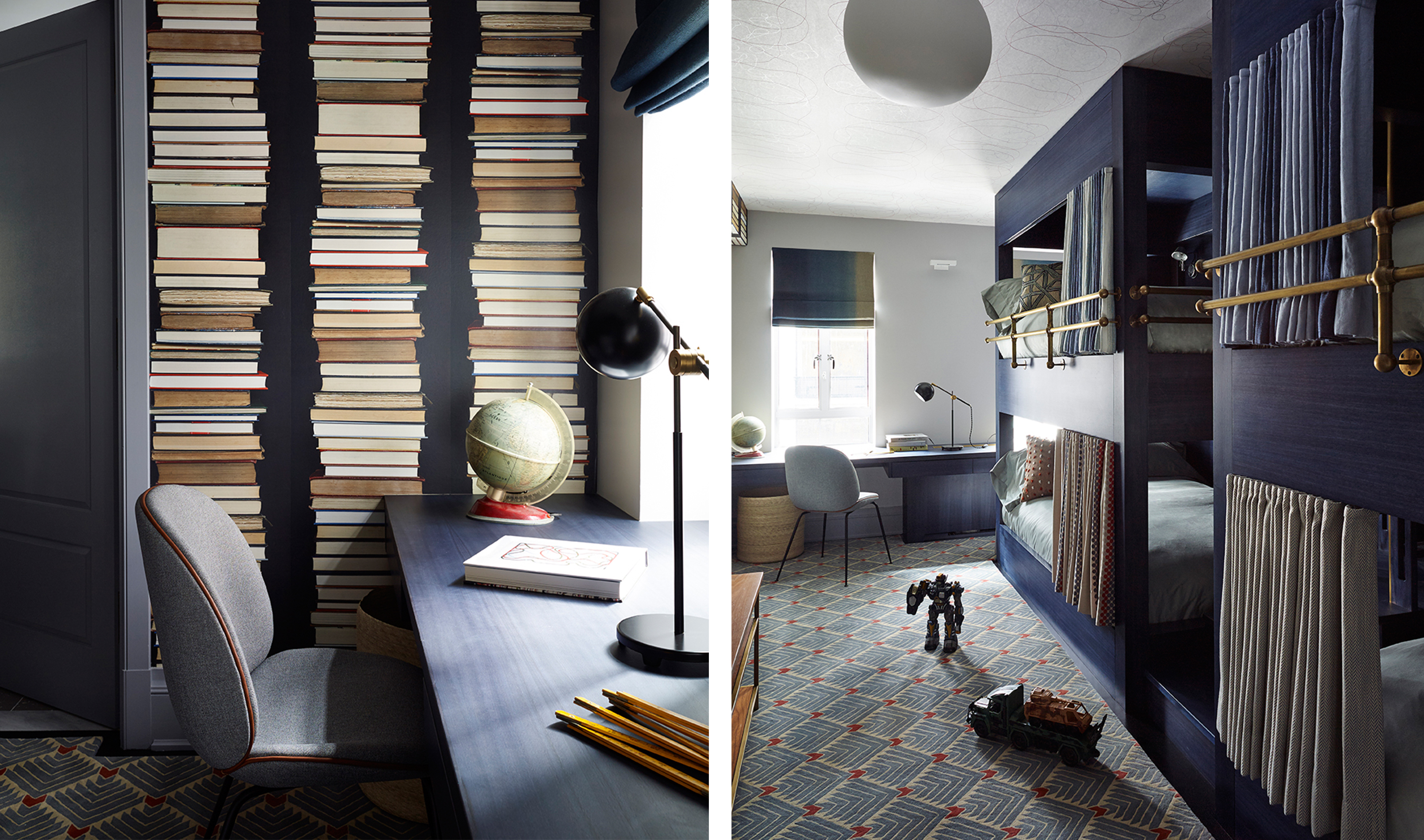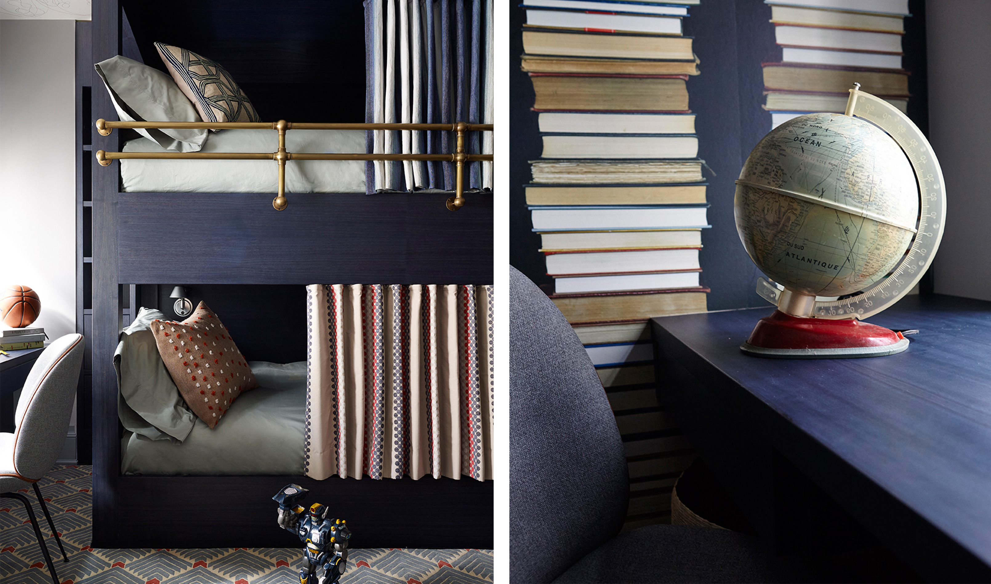 The design represents the client’s courage for bold statements and sensibility for daily life. Featuring custom millwork and bespoke furnishings throughout, from graphic, geometric bookshelves to built-in bunk beds, a glass and steel door developed hand in hand with the craftspeople who made it, and a custom lacquered dining table with gloss stripes, the result is a sophisticated and tailored space that is equally approachable.