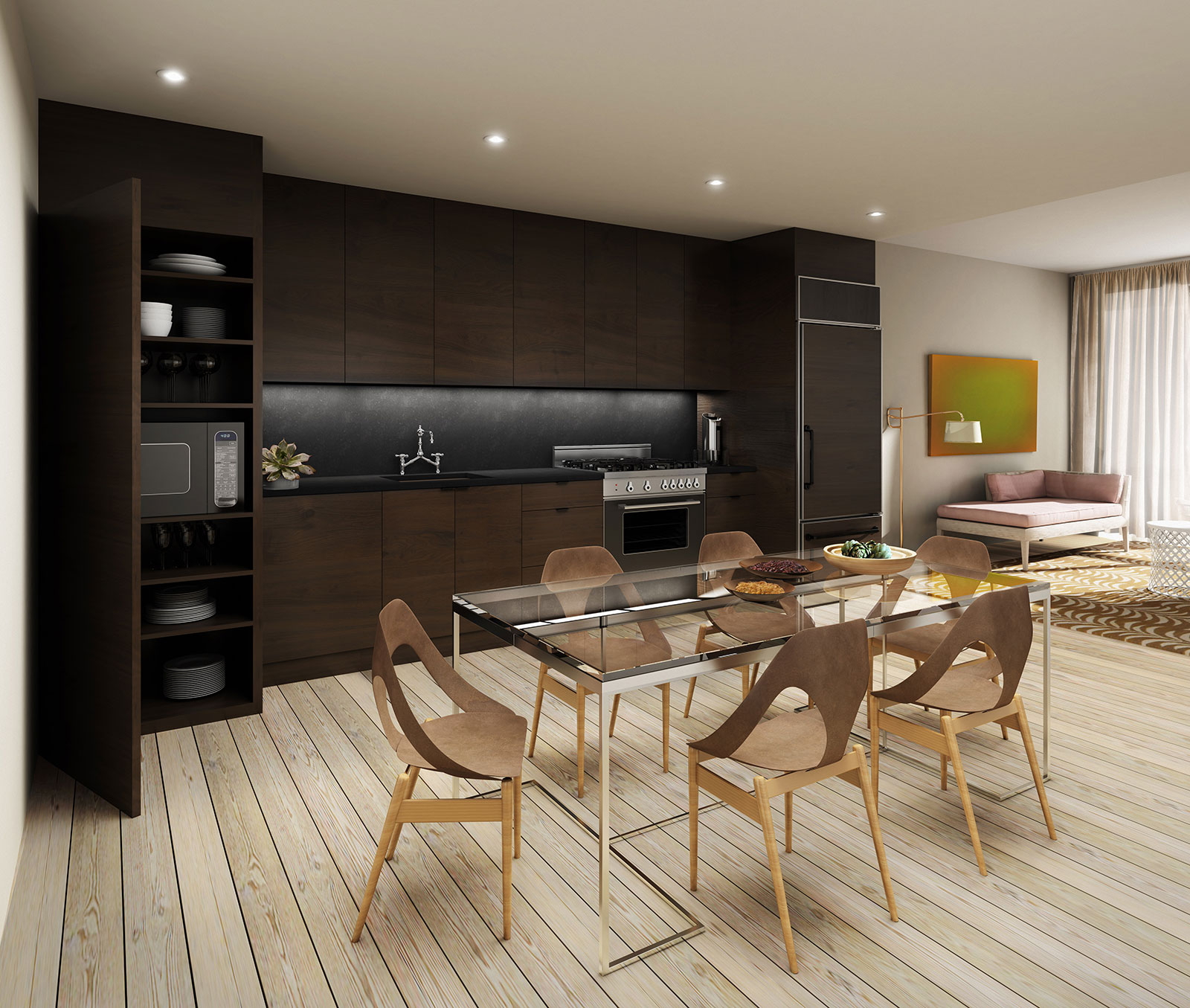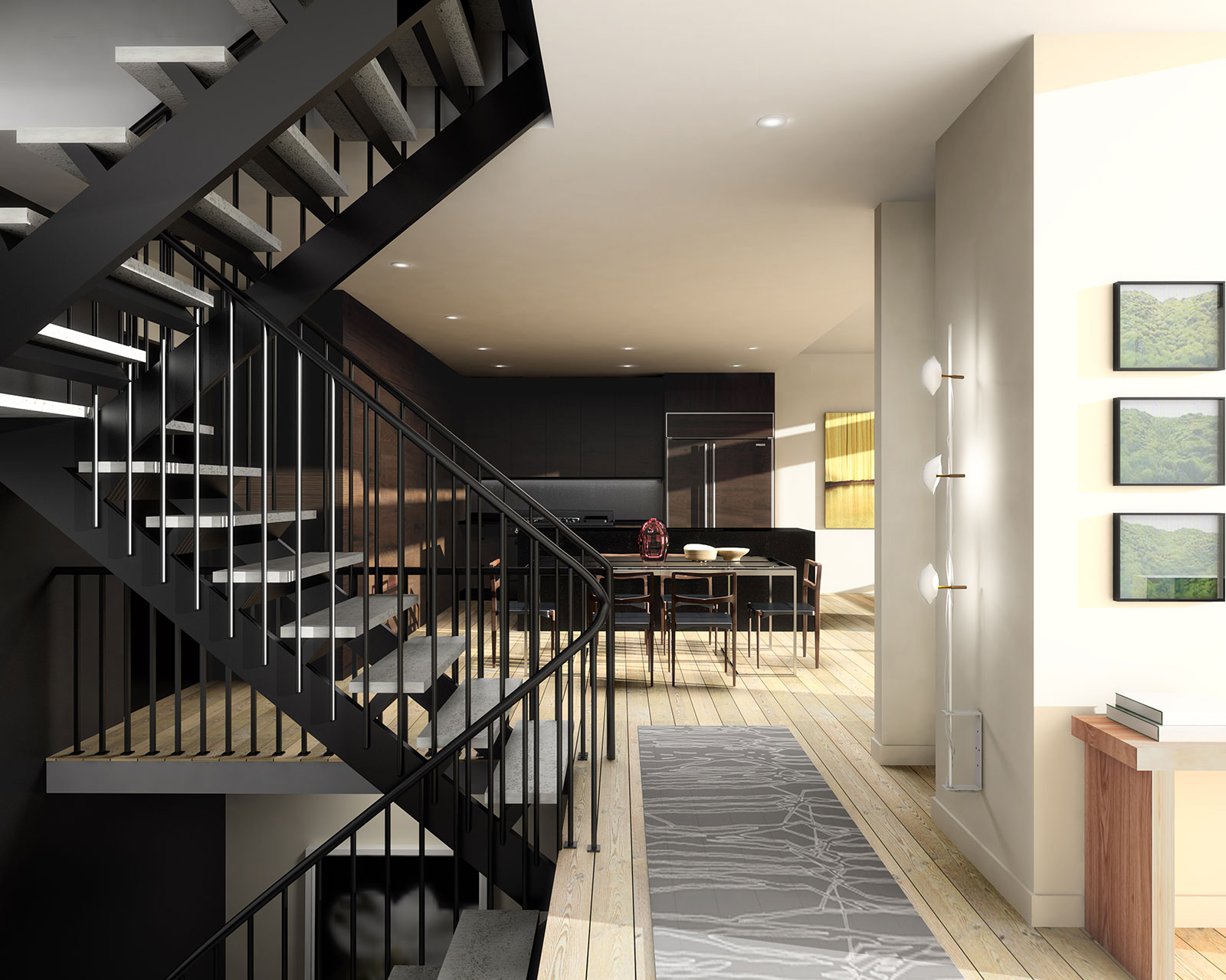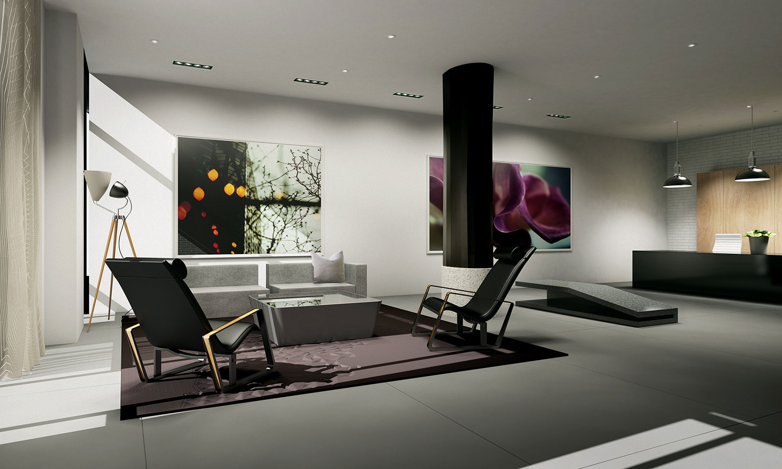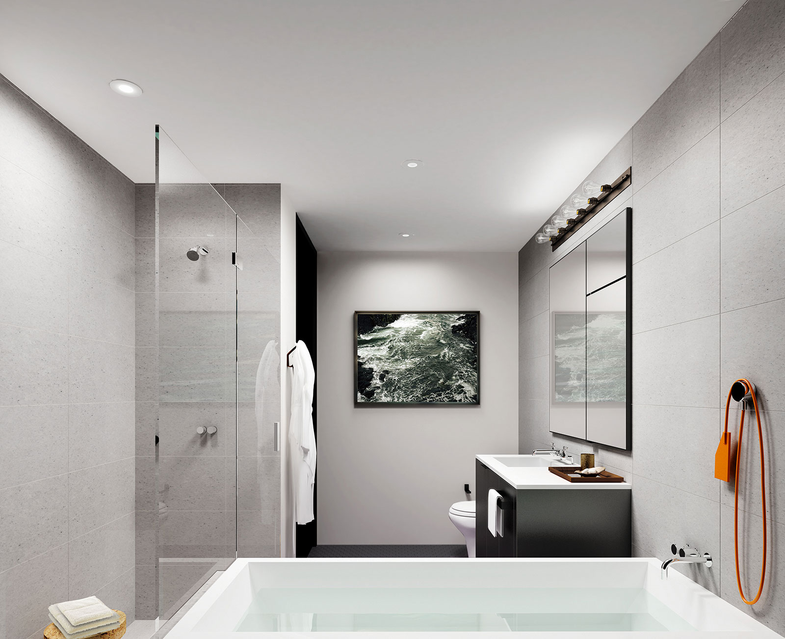 Right in the heart of the Chelsea art district, this comprehensive building identity stretches from the lobby and the corridors to the units and amenities. Evoking the quiet contemplation of an art gallery, the lobby arrangement takes its cues from the surrounding neighborhood. The individual units are kept largely neutral, but subtle details bring them to life, such as full height black-painted doors, master baths with lacquer vanities and playful accents in the form of bright orange hand showers. For the triplex penthouse unit, we developed a striking, text-based mural concept that appeals to the area’s art-savvy prospective buyers, while not detracting from the minimalist atmosphere. Custom-designed vanity light fixtures and blackened steel hardware reinforce the industrial tone.