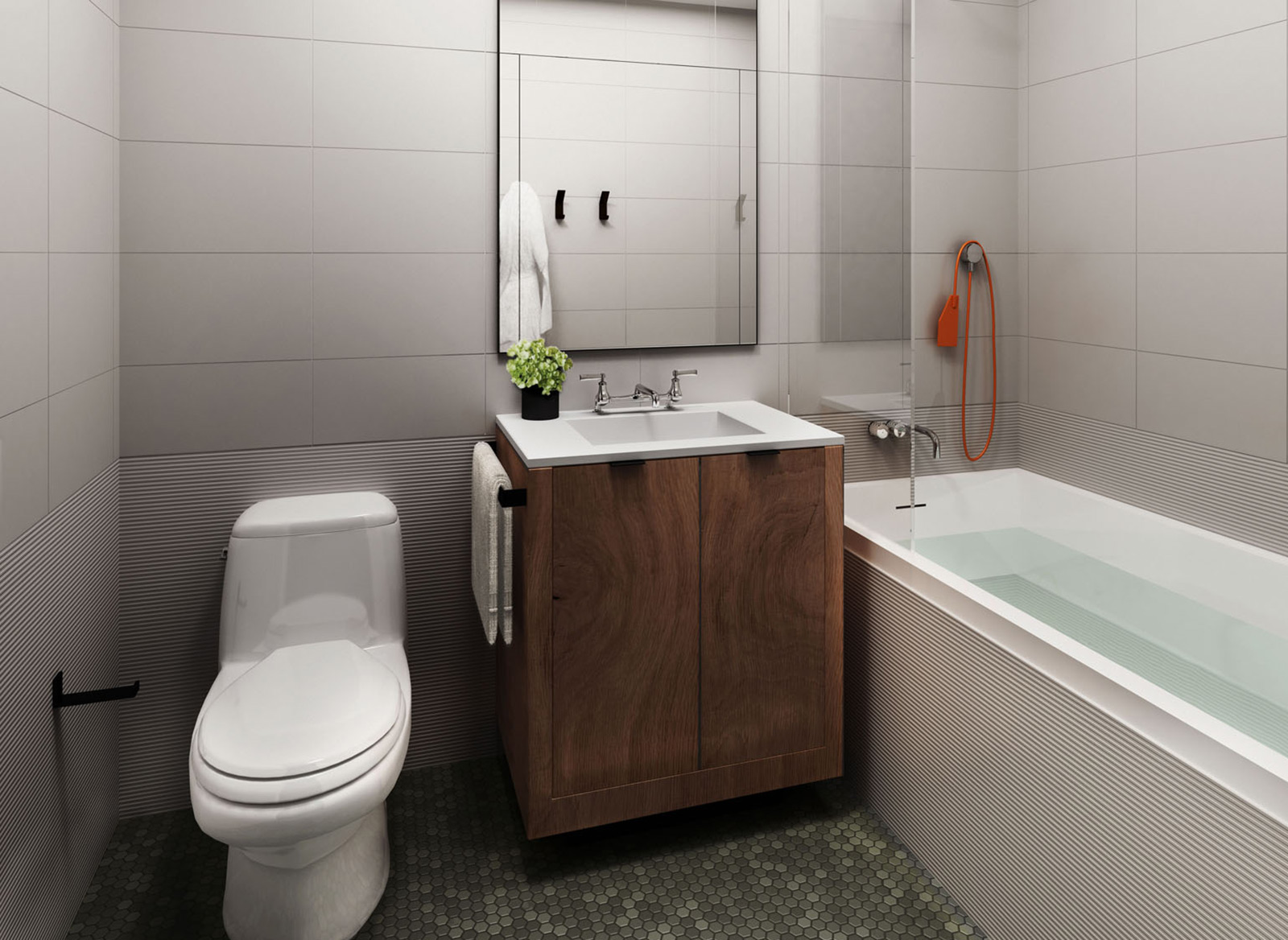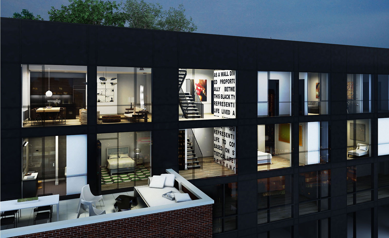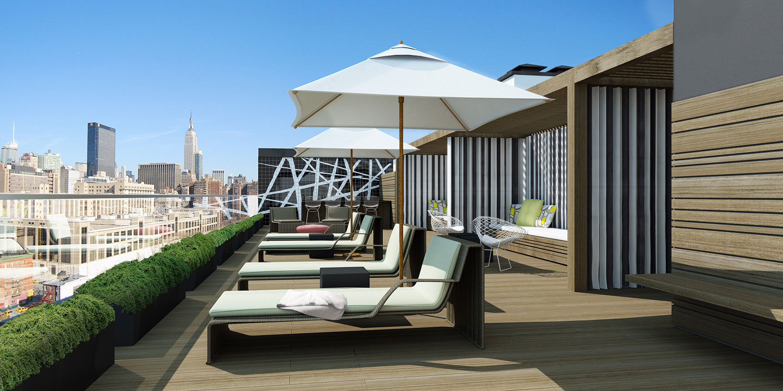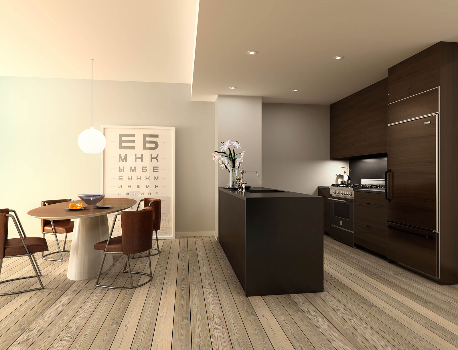 Right in the heart of the Chelsea art district, this comprehensive building identity stretches from the lobby and the corridors to the units and amenities. Evoking the quiet contemplation of an art gallery, the lobby arrangement takes its cues from the surrounding neighborhood. The individual units are kept largely neutral, but subtle details bring them to life, such as full height black-painted doors, master baths with lacquer vanities and playful accents in the form of bright orange hand showers. For the triplex penthouse unit, we developed a striking, text-based mural concept that appeals to the area’s art-savvy prospective buyers, while not detracting from the minimalist atmosphere. Custom-designed vanity light fixtures and blackened steel hardware reinforce the industrial tone.