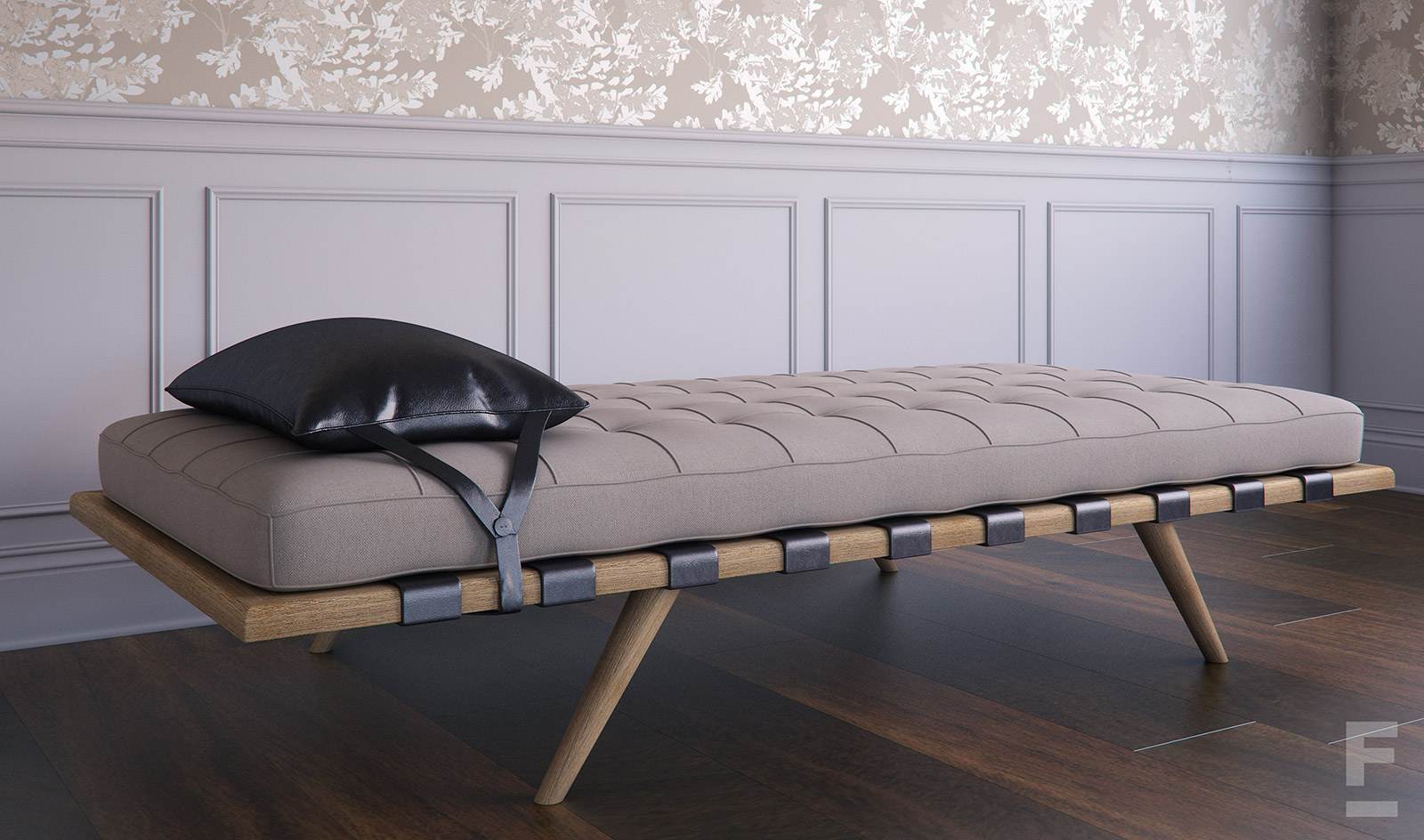 The Flatiron Daybed offers a comfortable twist on the classic mid-century modern daybed. A tufted fabric cushion sits atop a classic wood base, while sleek leather strapping and integrated pillow complete this piece’s simple elegance.