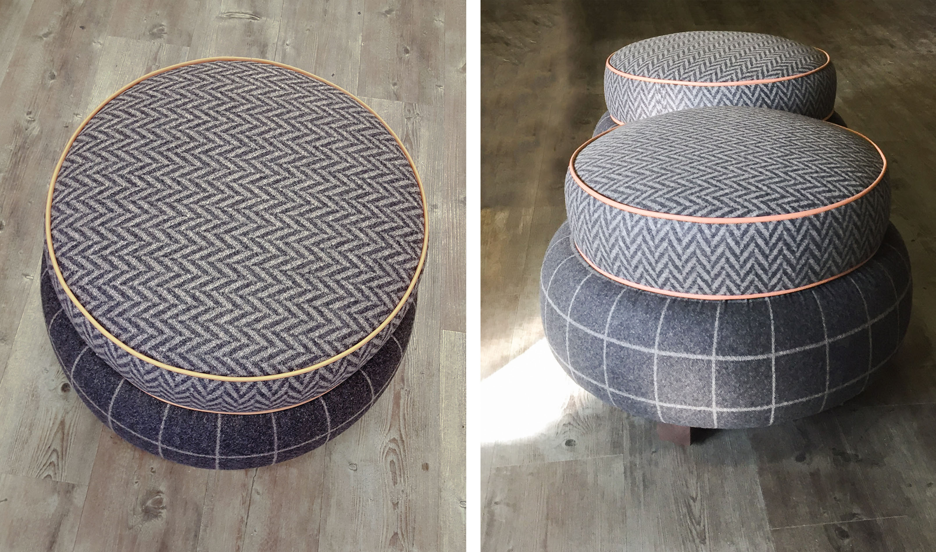 Ottoman footstool inspired by menswear patterns with offset charcoal patterns in 100% wool fabric with contrast lather piping. Set on a solid walnut X-style base.
