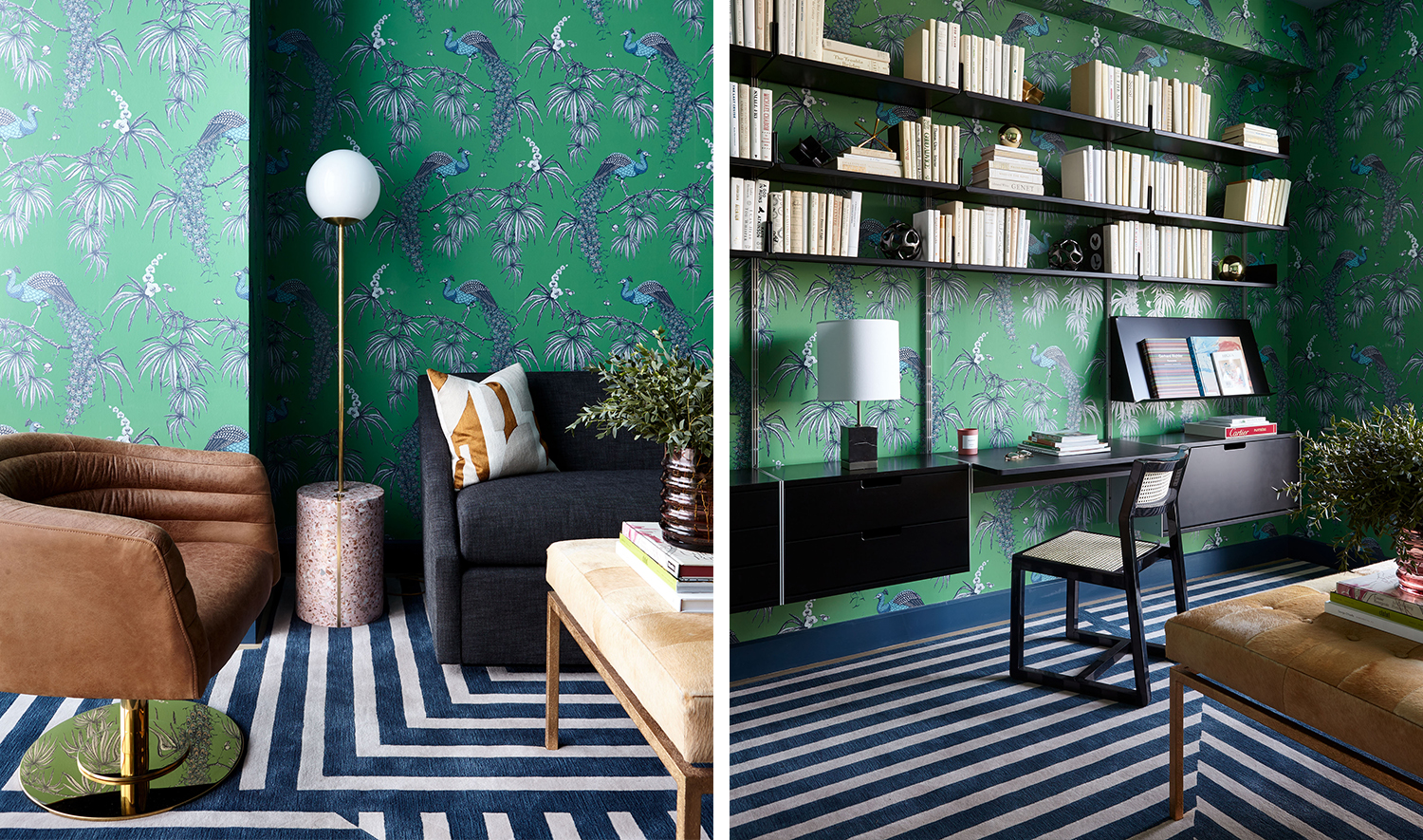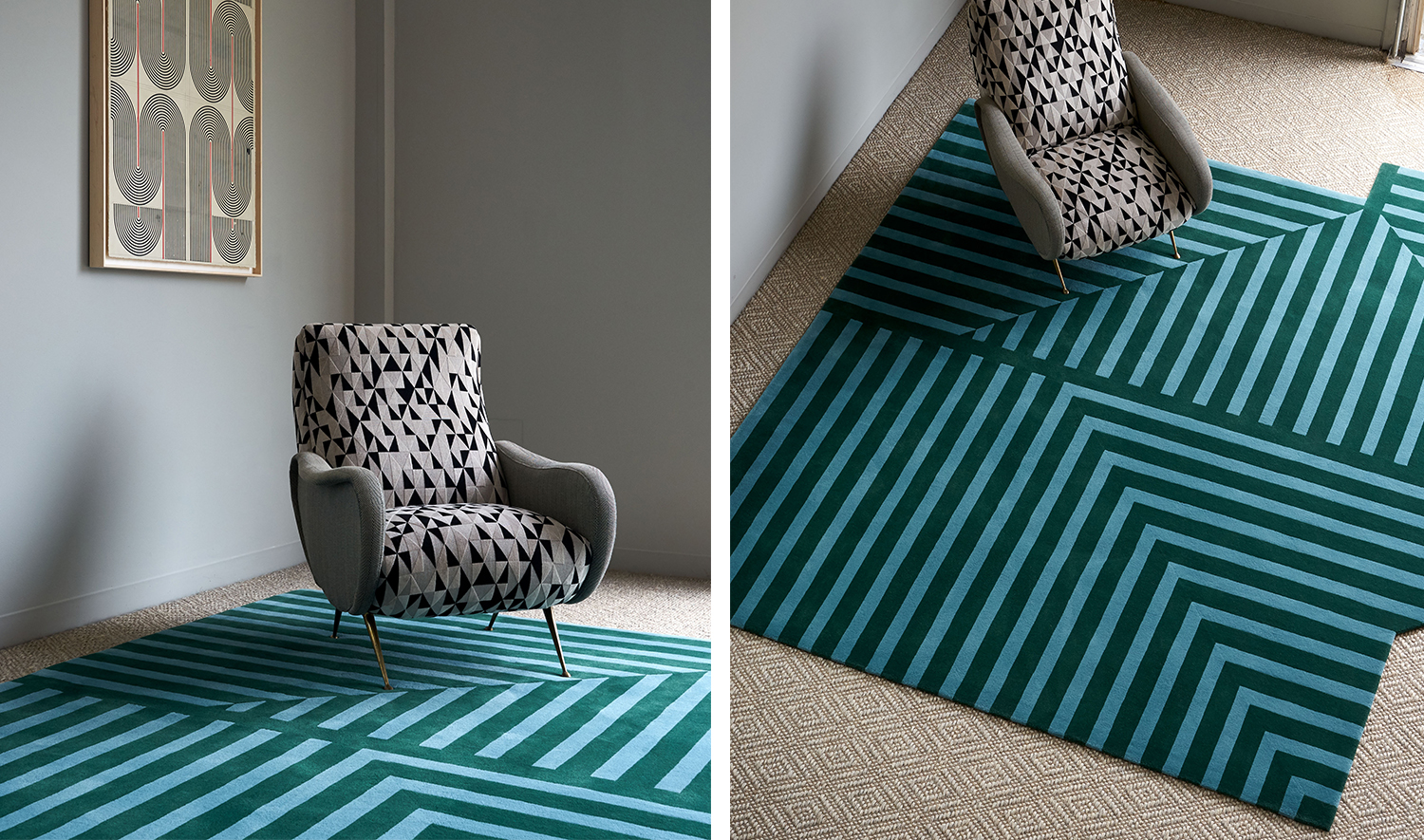 Taking the irregular shape of the classic Greek key rug, the Modern Greek Rug is a dynamic re-imagining of an enduring design. Alternating evergreen and cerulean stripes align and bisect the pattern, playing with your perception of space.