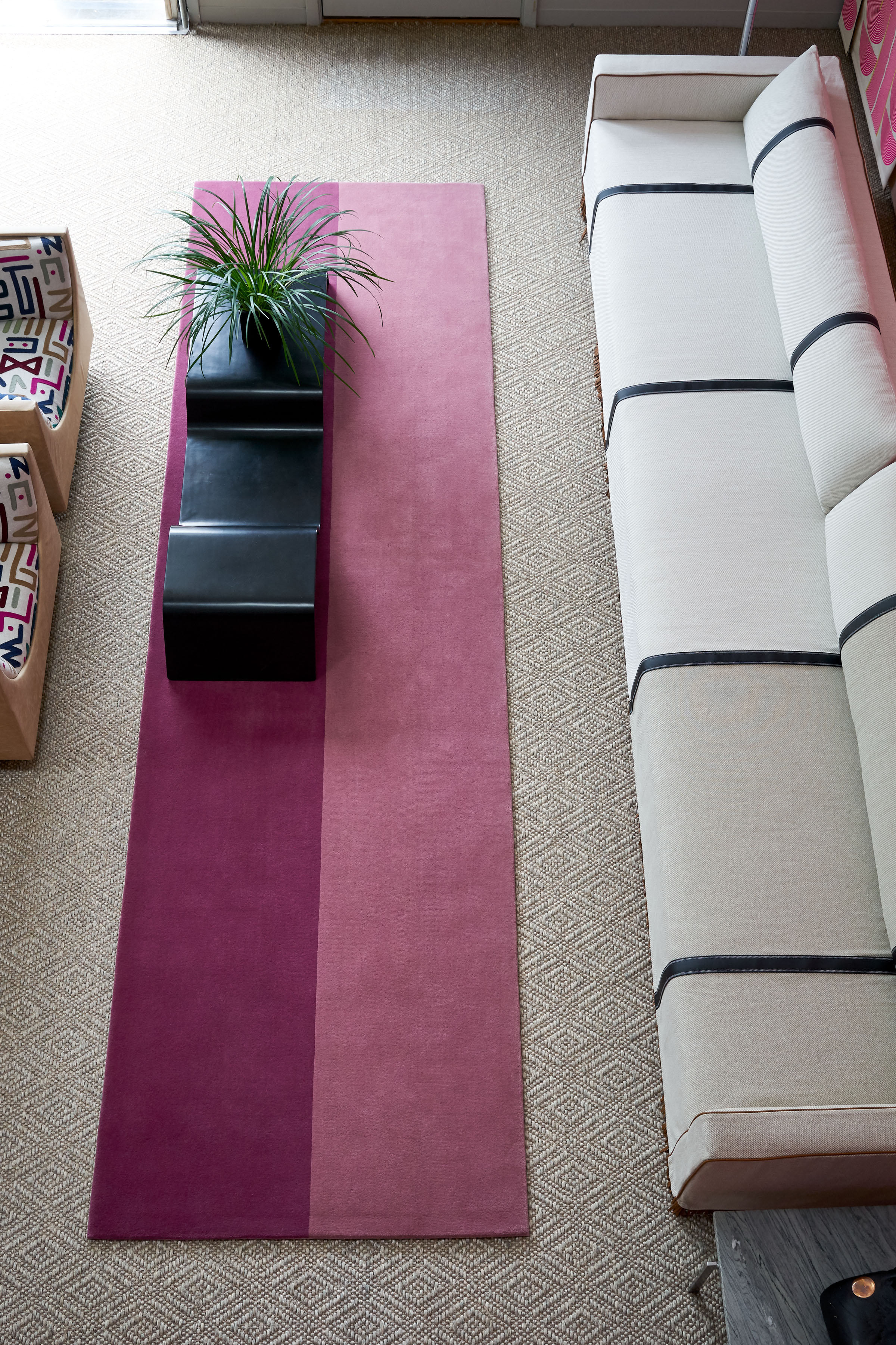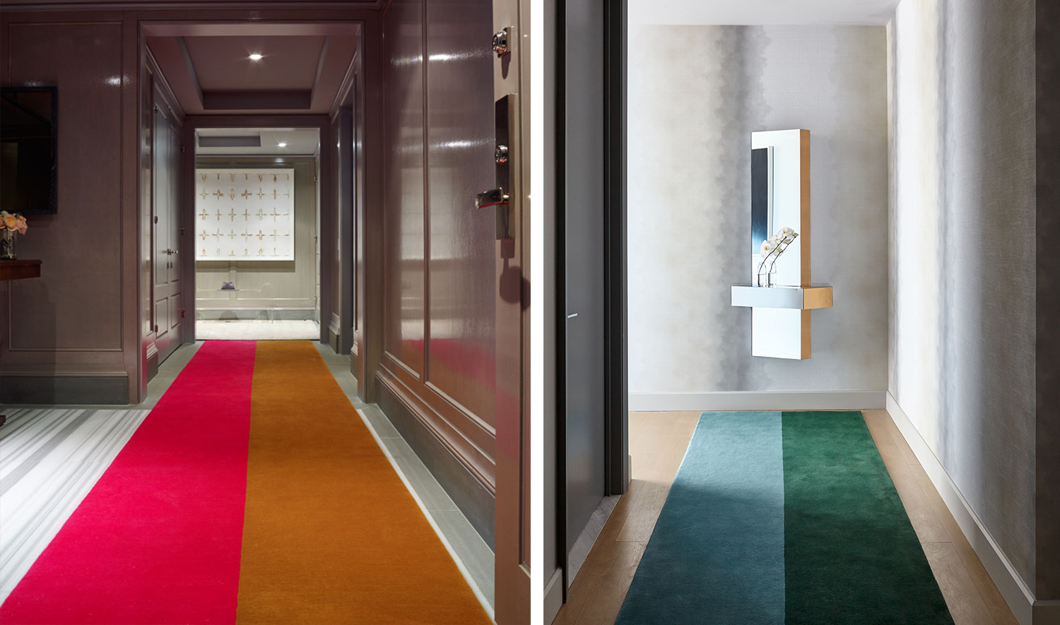 A lively contrast to the classic rug runner, the Sharp Split Rug creates a bold stripe effect to brighten an entry or hallway. Available in two colorways, including muted raspberry and dusty rose or evergreen and cerulean blue, the two side-by-side colors complement each other in a modern linear form.