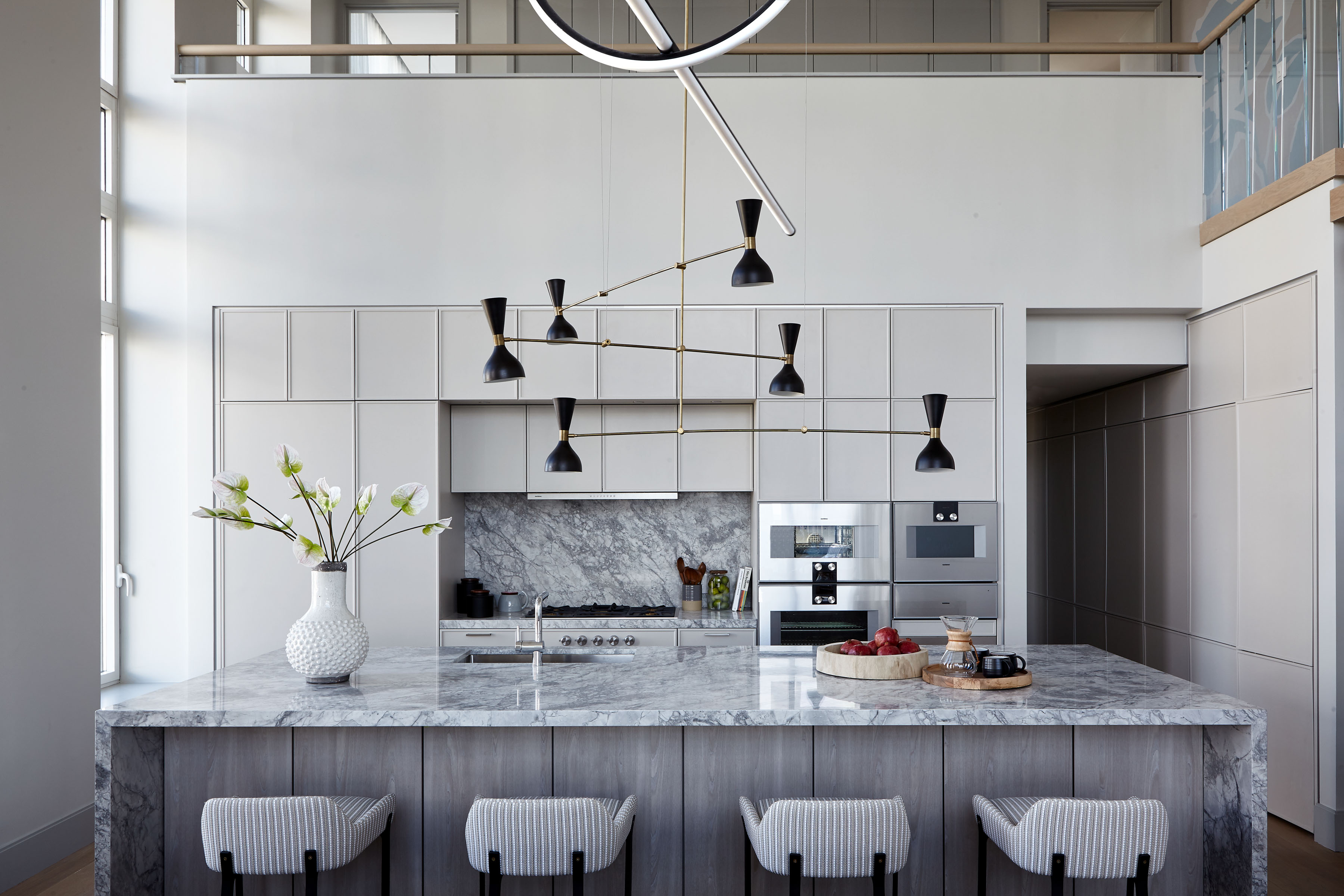 Across all units, a sense of tailored refinement is enriched with contrast and charismatic moments of discovery. An emphasis on volume and organic materials provide a serene canvas for everyday life, with wide-plank oak flooring, custom millwork, and neutral color palettes throughout. We introduced elements of surprise in a measured way, balancing simplicity and gracious volume with subtly patterned finishes, sculptural lighting, and dramatic, double height stone fireplace surround.