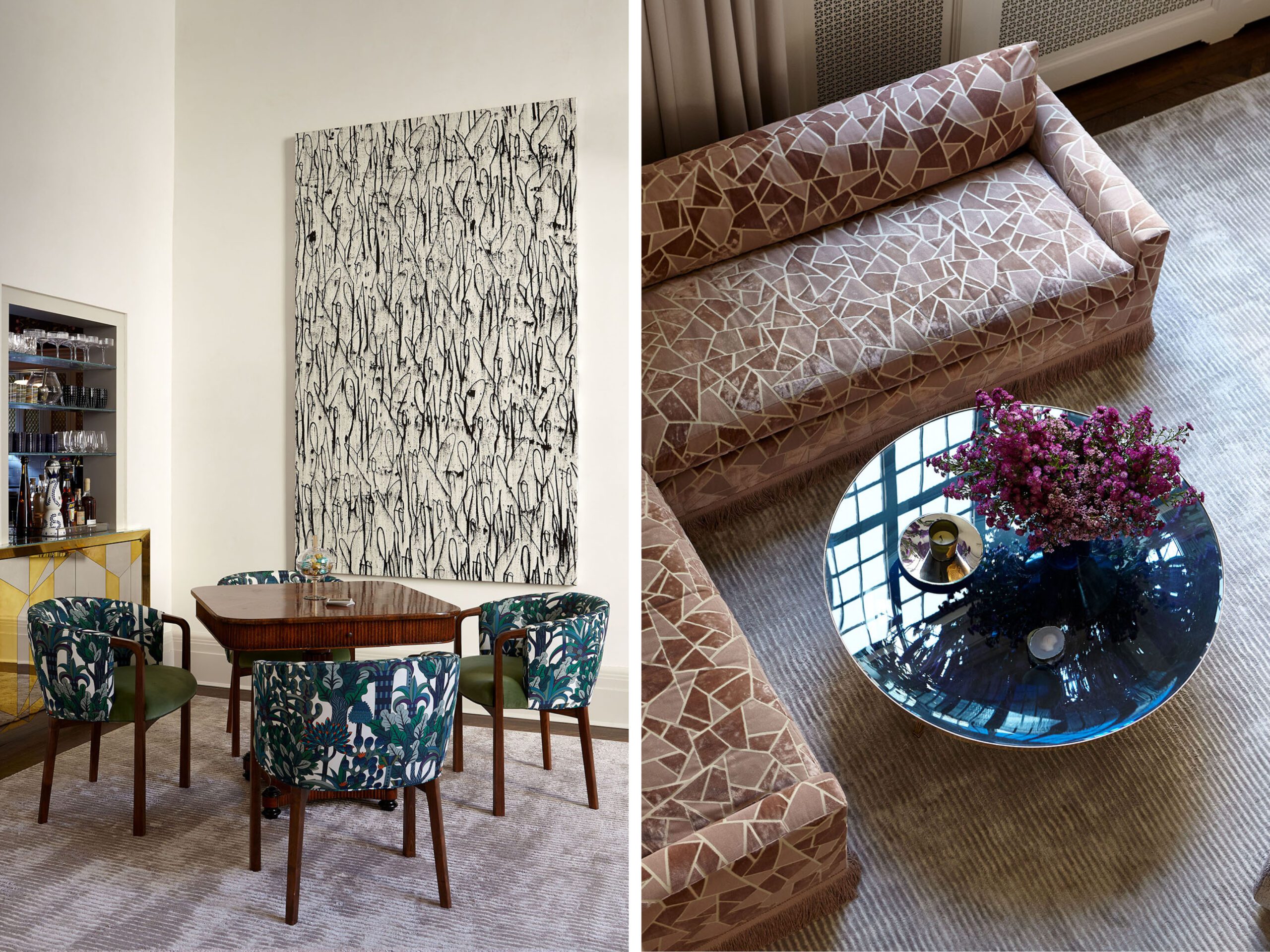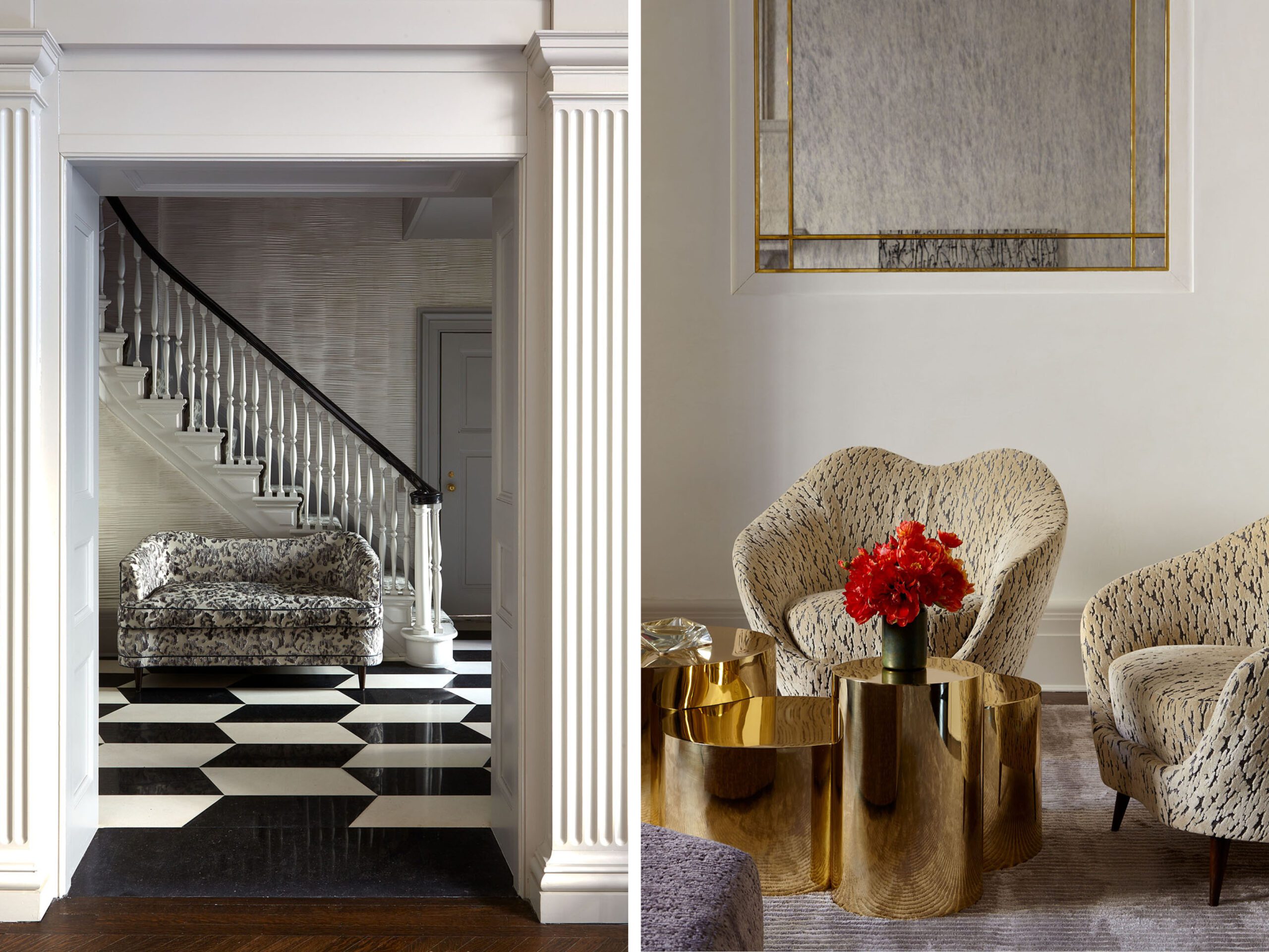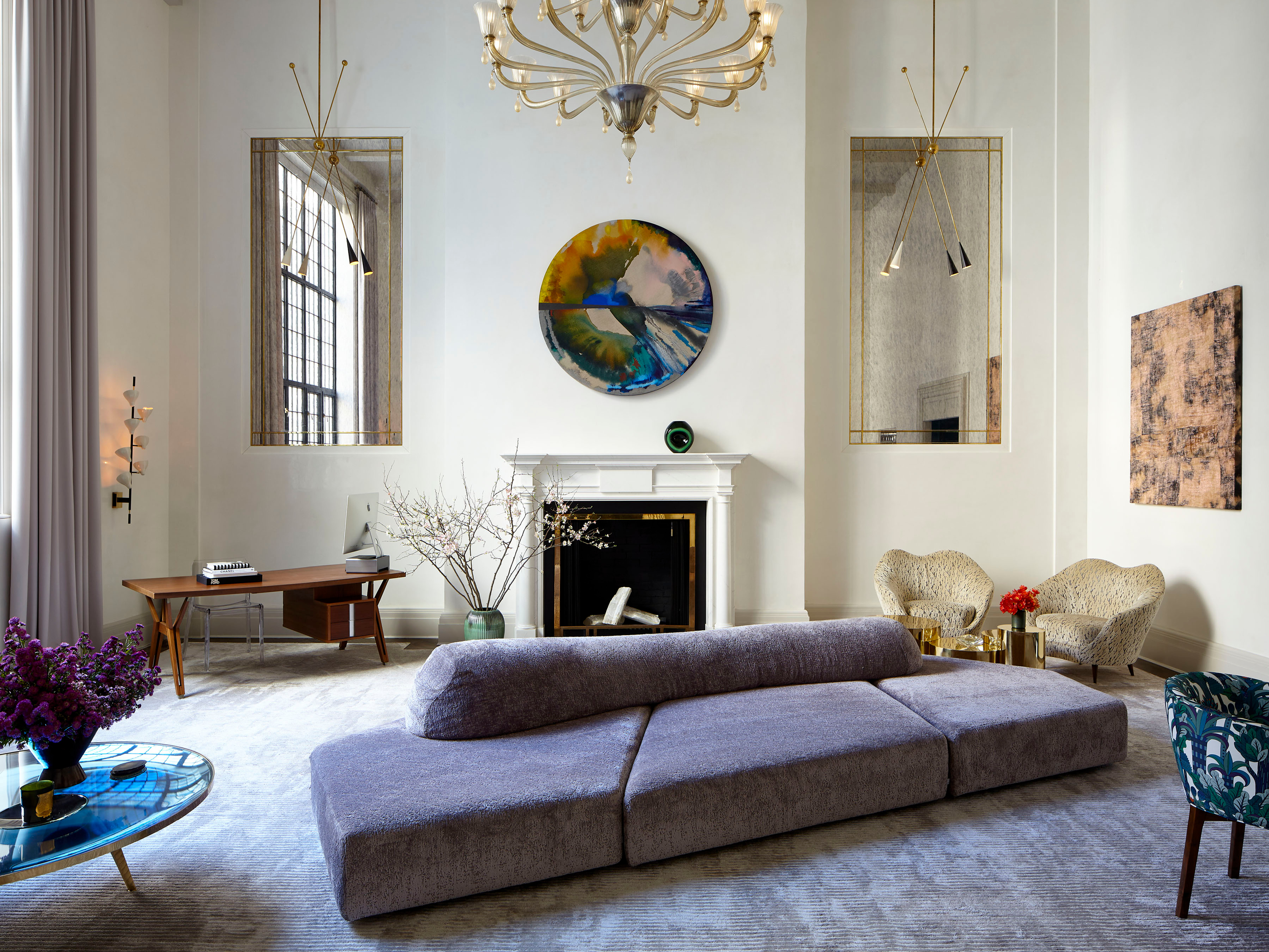 The centerpiece of the home is the double-height grand salon. We emphasized the volume of the space with the addition of a chandelier and mirrors flanking the fireplace, while creating a sense of livability and containment by reducing the number of openings. A custom-designed banquette sofa anchors the room, surrounded by vignettes that reflect the clients’ sensitive regard for vintage pieces and mid-century design. In the adjoining living spaces, we favored saturated color and pattern for more intimate, jewel box experiences.