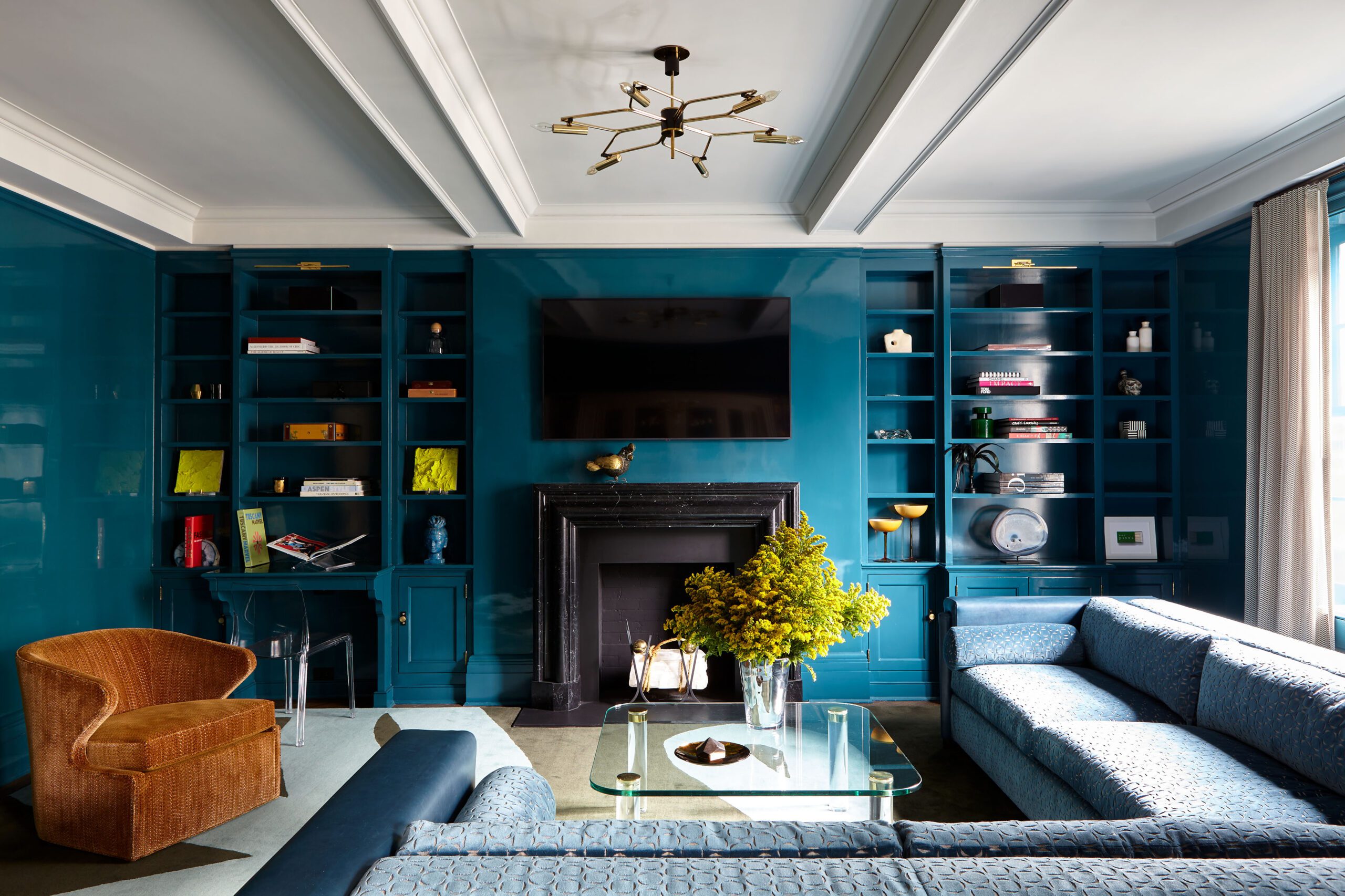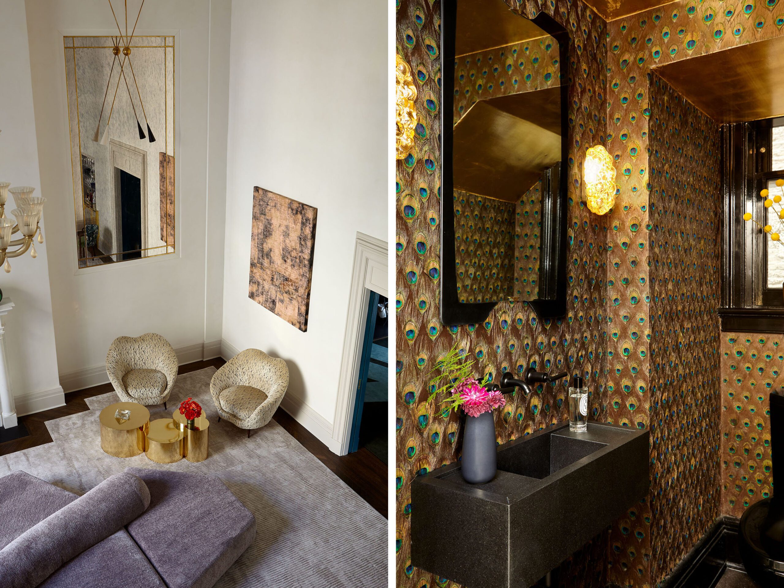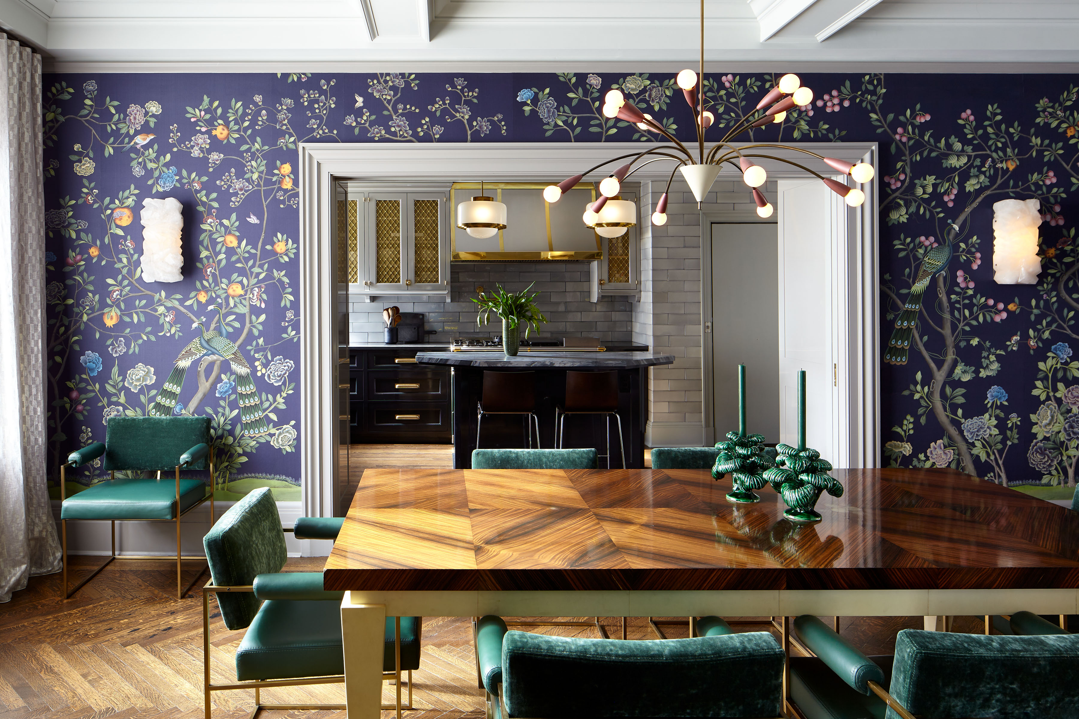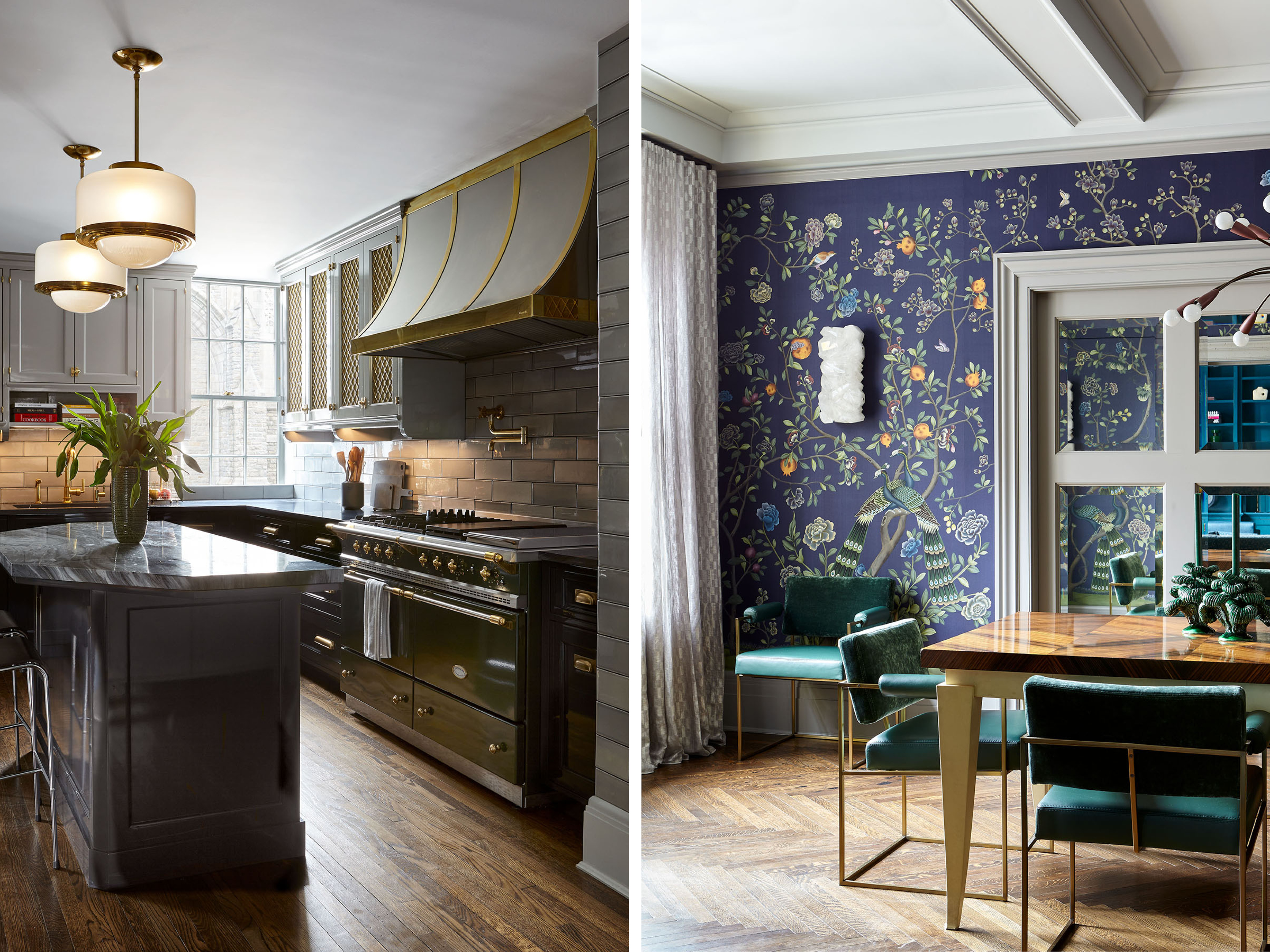 The centerpiece of the home is the double-height grand salon. We emphasized the volume of the space with the addition of a chandelier and mirrors flanking the fireplace, while creating a sense of livability and containment by reducing the number of openings. A custom-designed banquette sofa anchors the room, surrounded by vignettes that reflect the clients’ sensitive regard for vintage pieces and mid-century design. In the adjoining living spaces, we favored saturated color and pattern for more intimate, jewel box experiences.