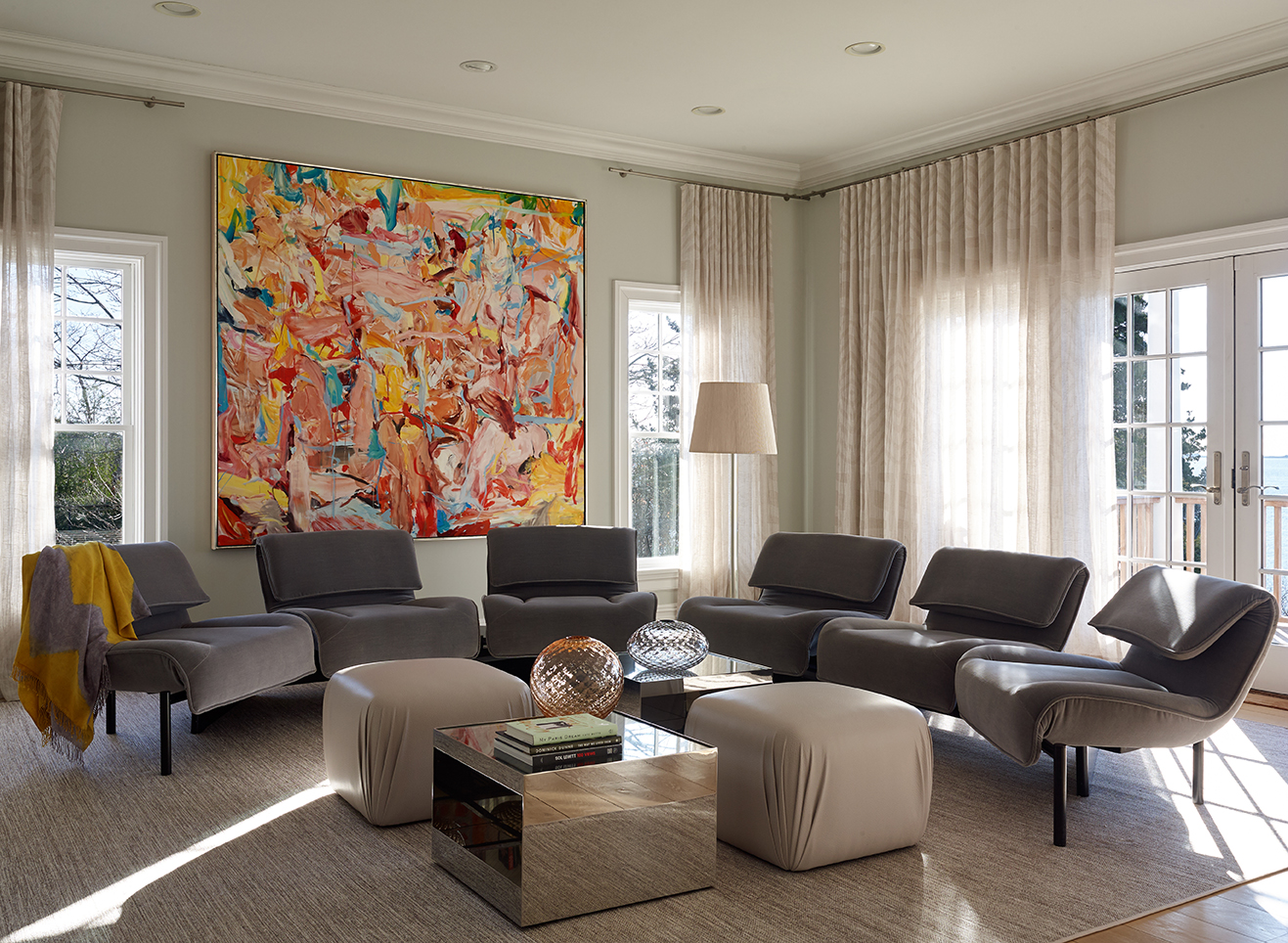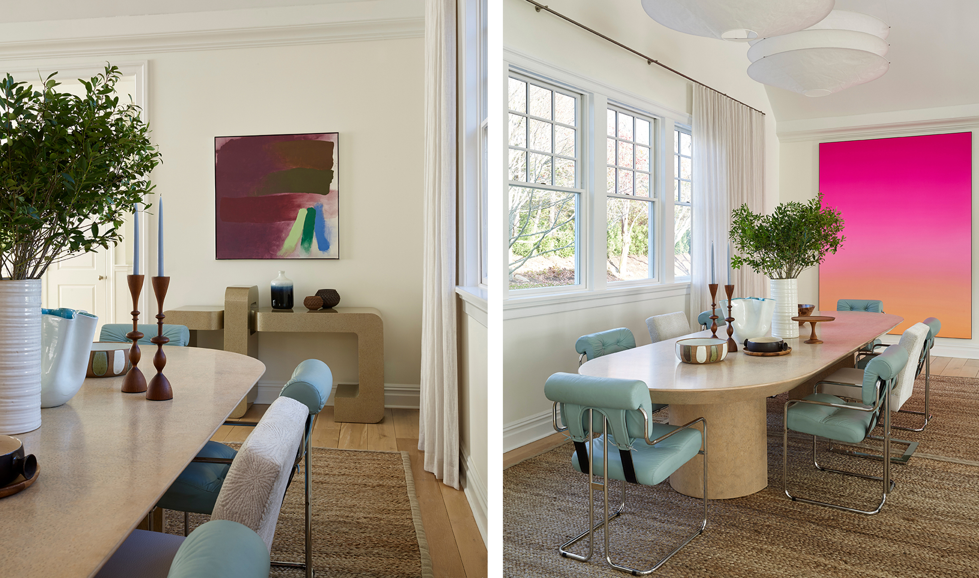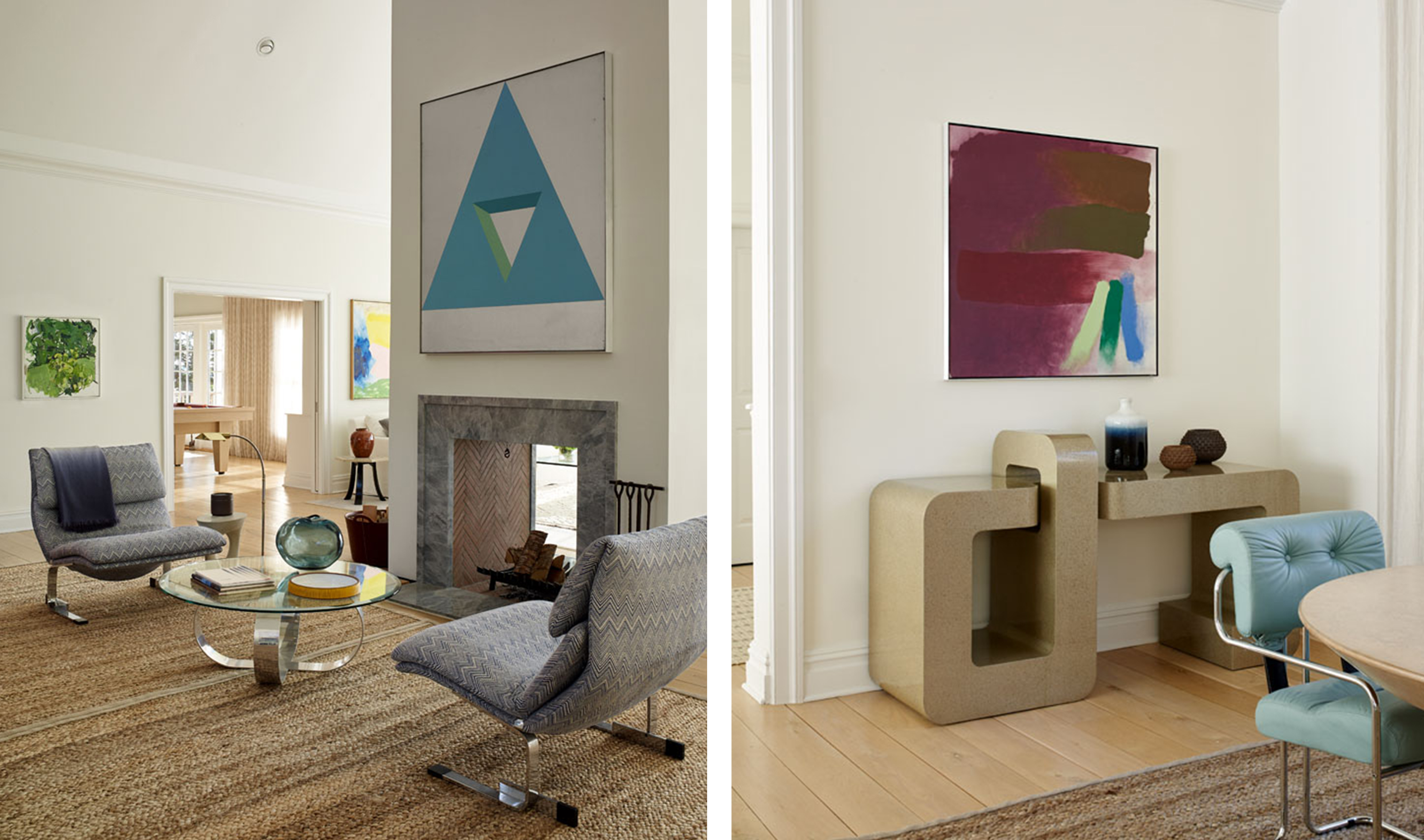 We built the art program for this property around the client’s interest in Abstract Expressionism. In addition to paintings by prominent 20th-century artists including Michael Goldberg, Friedel Dzubas, and Miriam Schapiro, we introduced vibrant, contemporary works by the likes of Matti Braun, the Campana Brothers and Merete Rasmussen to interact with the rest of the space. All together, they bring a layered and modern richness that is unexpected from its Hamptons setting.