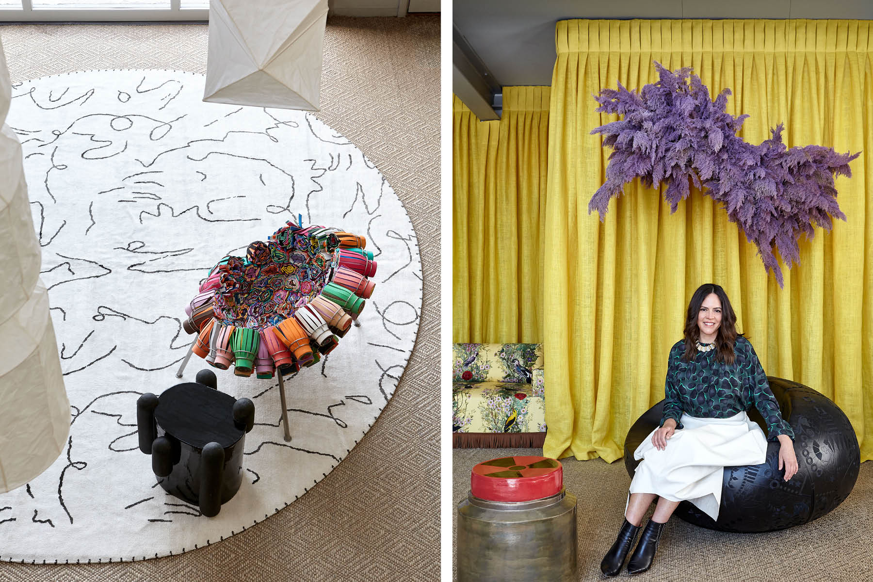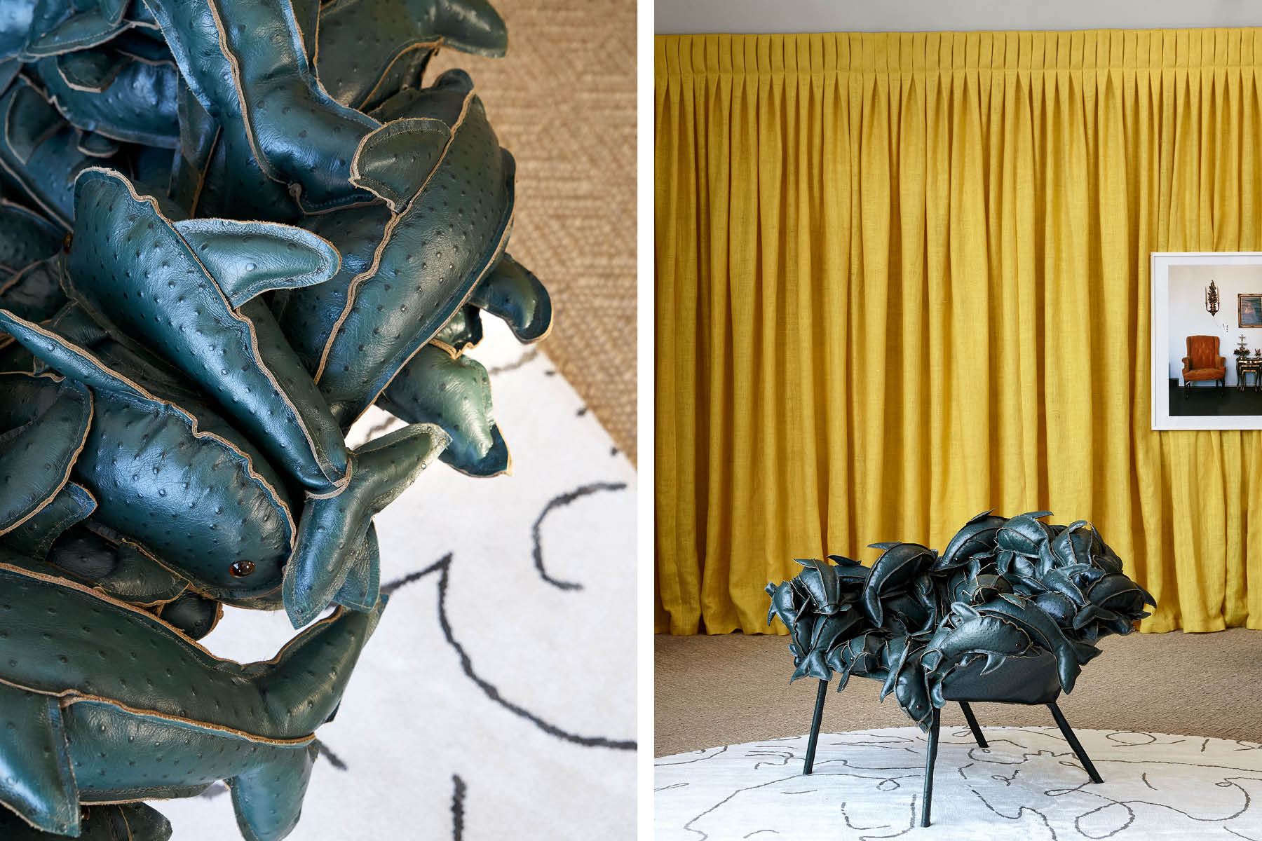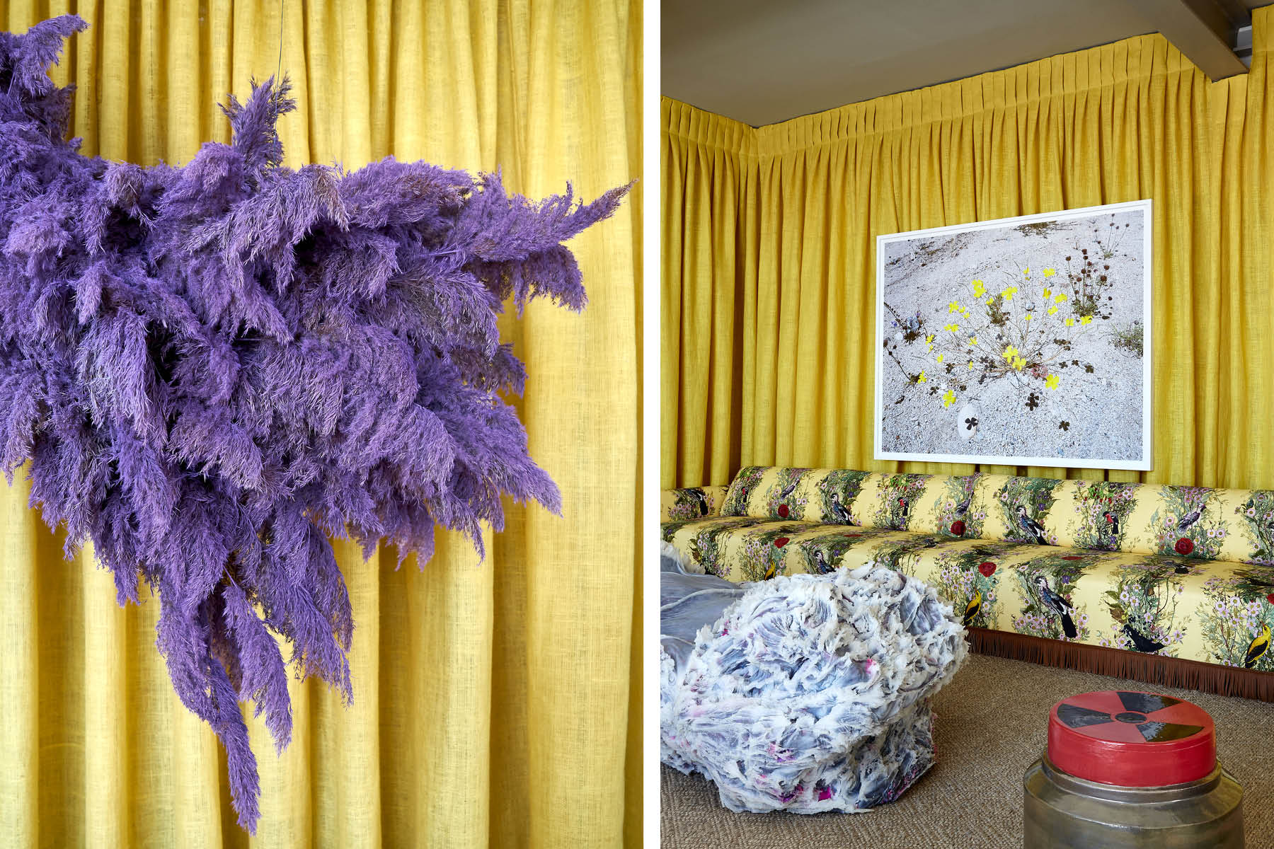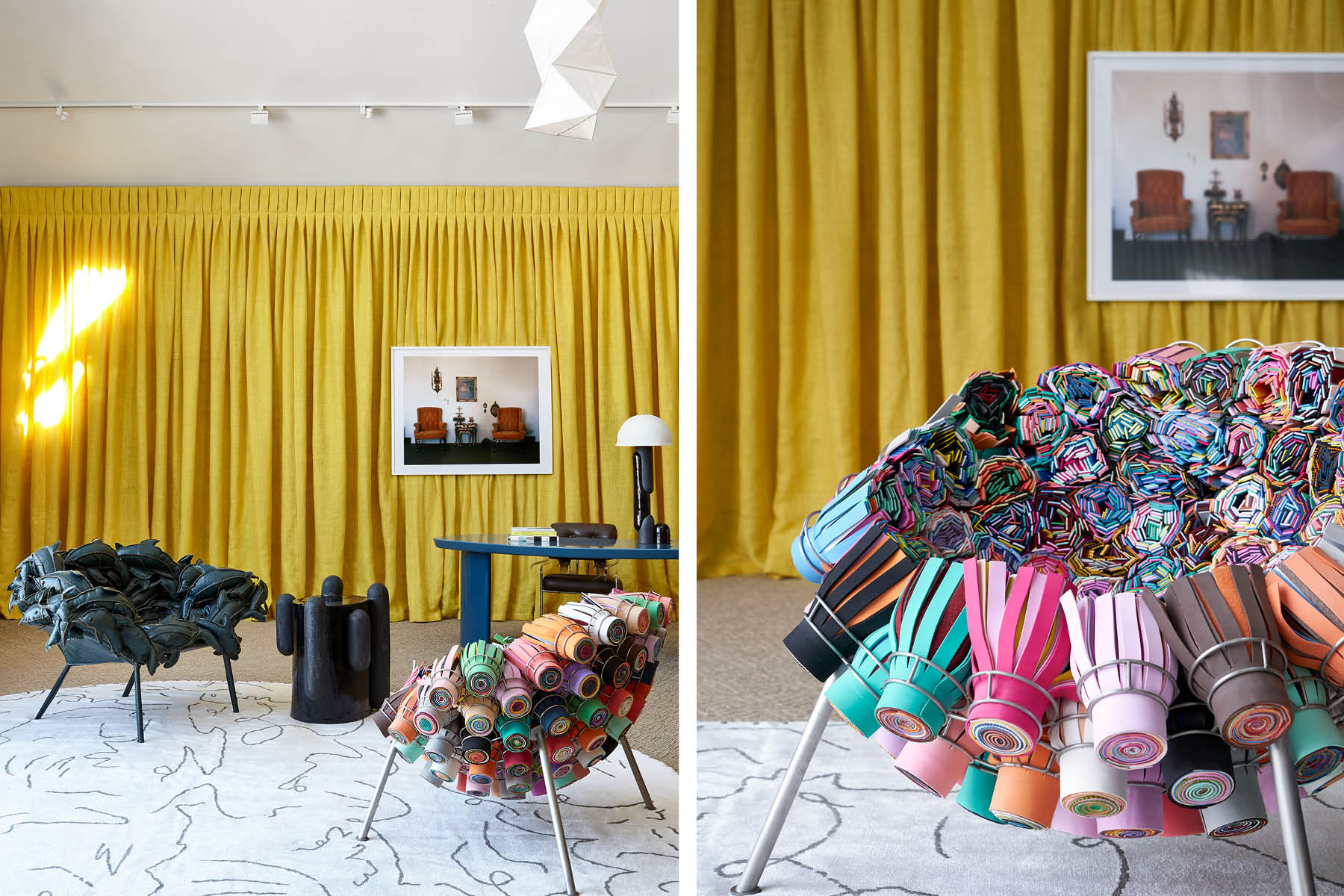 An inspirational refuge, the Winter Show offers much-needed warmth and comfort during a challenging moment. Curated by Elena Frampton, the show highlights photography, a Modernist rug from Doris Leslie Blau, a custom floral “chandelier,” and, in partnership with with Manhattan-based gallery Friedman Benda, expressive and experimental seating. A custom, double-height marigold curtain contains the scene within a volumetric color study that doubles as a metaphoric warm embrace. Works by emerging and established photographers including Craig McDean, Jesse Frohman, and Joshua Olley, present counter perspectives within the space. Frohman’s large-scale desert still life immediately draws the viewer’s eye with intense color and contrast, while works by Joshua Olley center on highly-personal themes of time, place, and liminal states. An omnipresence of curvilinear shapes complements the winding curtains, and abounds in a selection of one-of-a-kind ceramics, absurdist seating by the Campana Brothers, a Marcel Wanders lounge chair, and most strikingly in the Modernist circular area rug from Doris Leslie Blau, in honor of the showroom’s name-sake industry titan. An aesthetically complex moment of contradictions, brought to life through art and design.