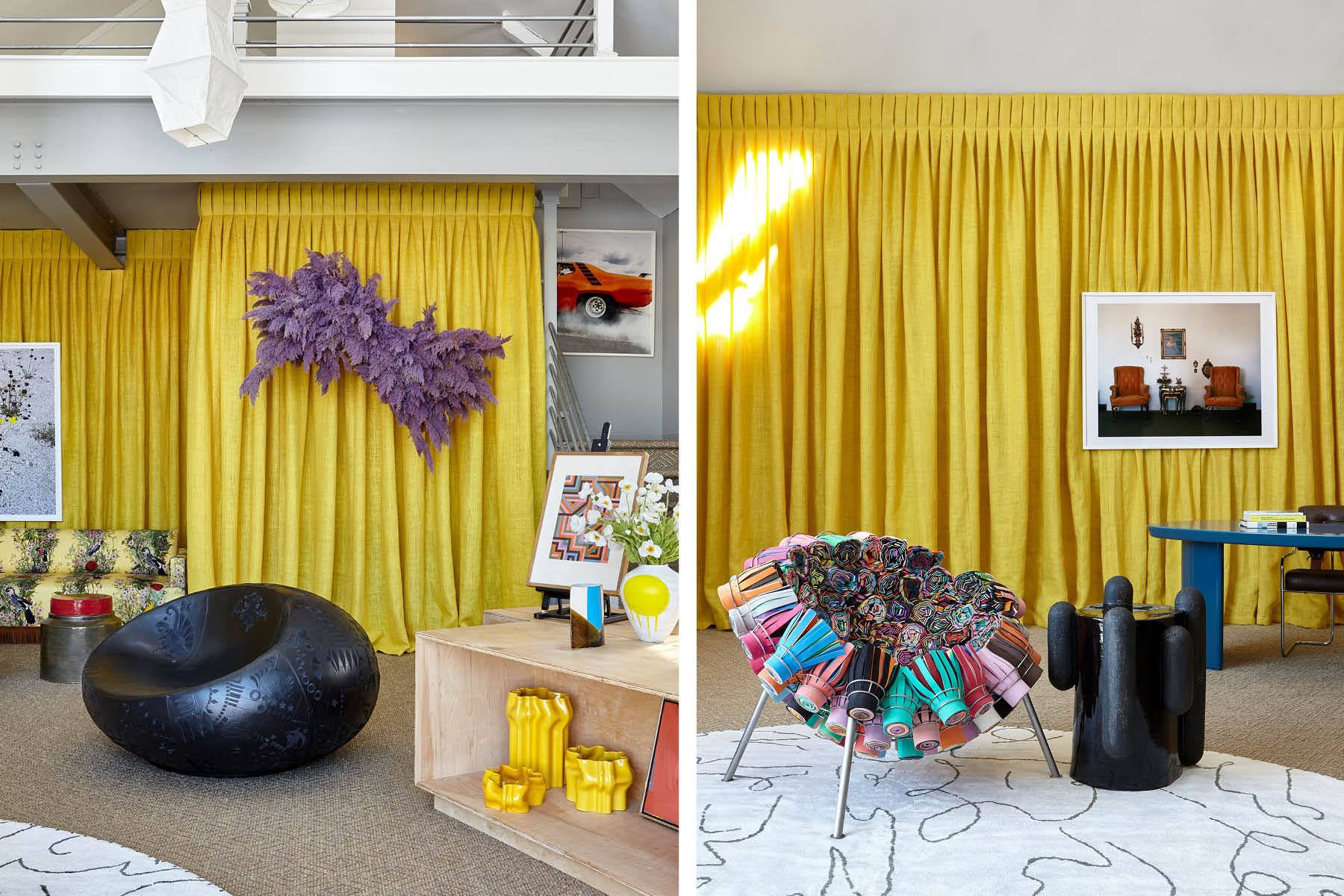 An inspirational refuge, the Winter Show offers much-needed warmth and comfort during a challenging moment. Curated by Elena Frampton, the show highlights photography, a Modernist rug from Doris Leslie Blau, a custom floral “chandelier,” and, in partnership with with Manhattan-based gallery Friedman Benda, expressive and experimental seating. A custom, double-height marigold curtain contains the scene within a volumetric color study that doubles as a metaphoric warm embrace. Works by emerging and established photographers including Craig McDean, Jesse Frohman, and Joshua Olley, present counter perspectives within the space. Frohman’s large-scale desert still life immediately draws the viewer’s eye with intense color and contrast, while works by Joshua Olley center on highly-personal themes of time, place, and liminal states. An omnipresence of curvilinear shapes complements the winding curtains, and abounds in a selection of one-of-a-kind ceramics, absurdist seating by the Campana Brothers, a Marcel Wanders lounge chair, and most strikingly in the Modernist circular area rug from Doris Leslie Blau, in honor of the showroom’s name-sake industry titan. An aesthetically complex moment of contradictions, brought to life through art and design.