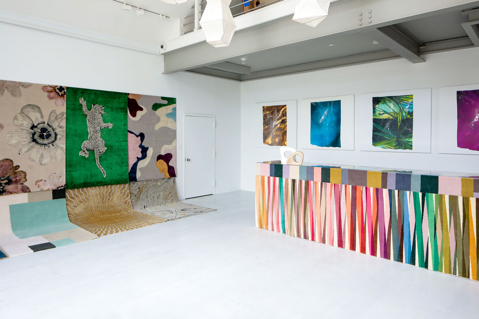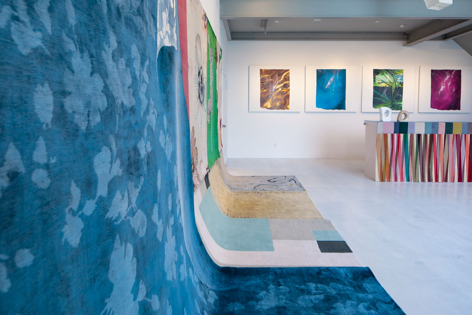 Inspired to bring an element of the three-dimensional to a typically two-dimensional object, Elena Frampton designed “Undercover” using a trompe l’oeil effect. The design marries optical illusion with traditional ornamentation, as a floral-patterned rug appears to peel back from the floor at opposing corners, offering both a decorative and architectural statement within interior space. Echoing the inspiration behind “Undercover,” the exhibition re-contextualizes form, function, and ornamentation in the display. Rugs cascade down the wall and onto the floor, putting the artistry and creative vision of the designs in full view. The selection of rugs, curated by Elena Frampton, include creative perspectives across a range of industries with additional designs by Diane von Furstenberg, Rodarte, Mary Katrantzou, Paul Smith, Sarabande, and The Rug Company.